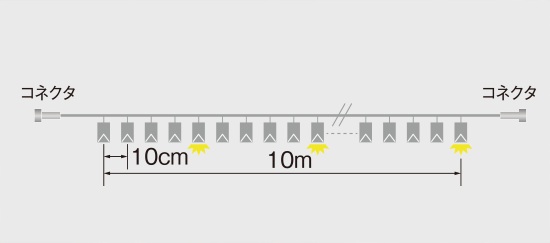 | 仕様 | LEDが5球に1球の割合で点滅 拡散LED 黒コード 重量:0.6kg サイズ:10m 電源:AC100V 消費電力:8W 防滴仕様 連結可能数:10 ※延長用には電源コードが付いていません。 |