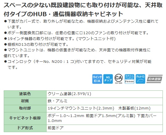 | 仕様 | 天井取り付けタイプ 外形寸法mm:ヨコ650・タテ160・フカサ650 取付可能ユニット:2U 質量kg:12.5 |
