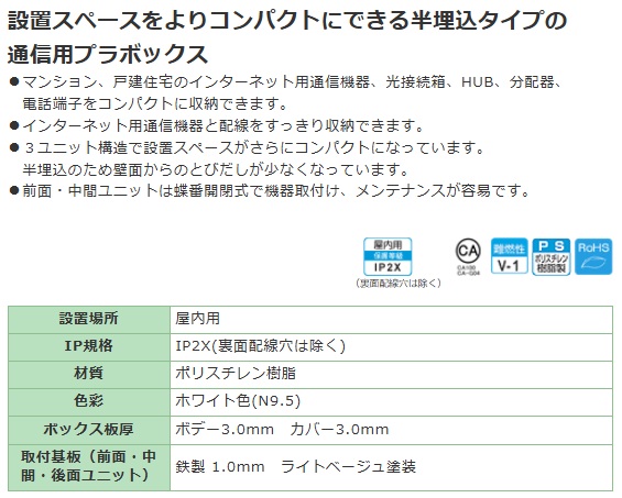 | 仕様 | スタンダードタイプ(半埋込み・3ユニット構造・コンセント付) 外形寸法mm:ヨコ350・タテ300・フカサ80 埋込フカサ:59(付属のワッシャを使用した場合 57) 質量kg:2.7 適用:L型3コ口コンセント1コ付 |