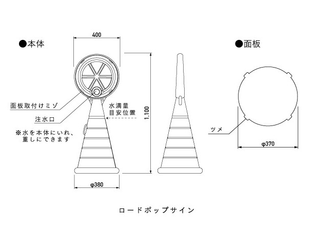 仕様 | 本体サイズmm:W400×H1100×D380 重 さ:4kg(水満量時32kg) 材 質:本体/ポリエチレン樹脂 面版/PET(割れにくい樹脂) 耐風速:水満量時 25m/s 砂満量時 30m/s ※面板は付属しておりません |