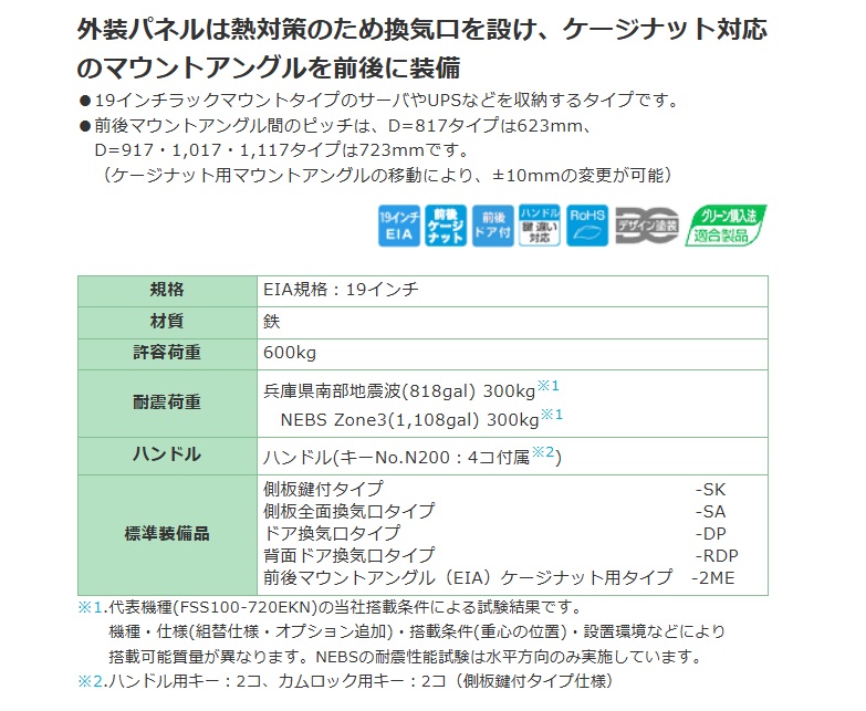 | 仕様 | EIA規格:19インチ 外形寸法mm:ヨコ600・タテ2,300・フカサ917 パネル取付有効スペース:EIA(タテ)49U 製品質量kg:118 ※U=44.45 |