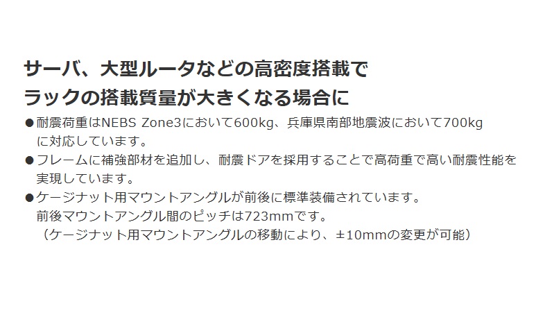 | 仕様 | EIA規格:19インチ 外形寸法㎜:ヨコ600・タテ2,300・フカサ917 パネル取付有効スペースEIA(タテ):49U 製品質量kg:130 ※U=44.45 |