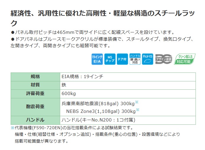 | 仕様 | EIA規格:19インチ 外形寸法mm:ヨコ700・タテ2,300・フカサ800 パネル取付有効スペース:EIA(タテ)49U 製品質量kg:110 ※U=44.45 |