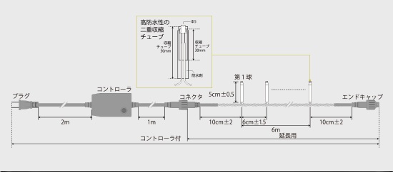 | 仕様 | 拡散LED(赤・青・緑・黄の4色) IPX6 防滴仕様 連結可能数:10 コード色:グリーン/クリア 重量:0.8kg 全長:6m 電源:AC100V 消費電力:8W |