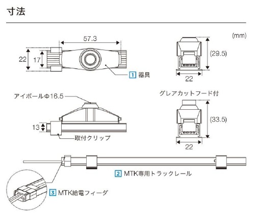 | 仕様 | ※点灯には、MTK専用トラックレールとMTK給電フィーダと電源が必要です。 光源色:3500K(高演色タイプ) 配光:24° 灯体色:シルバー 定格電圧:DC24V 消費電力:1.6W 演色性:Ra95 調光方式:PWM |