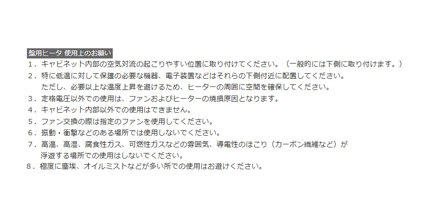 | 仕様 | ヒーター素子:PTCヒータ 定格容量 W(ヒータ発熱量):約200 定格電圧 V(単相):AC100 寸法mm:ヨコ105・タテ58(85)・フカサ83(89) ※寸法の( )内は固定金具を含んだ寸法です。 質量kg:0.5 |