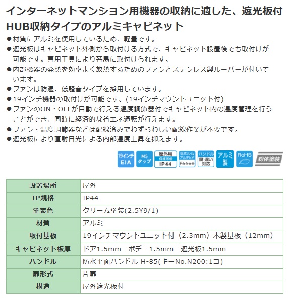| 仕様 | 屋外遮光板付タイプ 外形寸法mm:ヨコ880・タテ748・フカサ290 取付可能ユニット:3U 質量kg:26.4 |