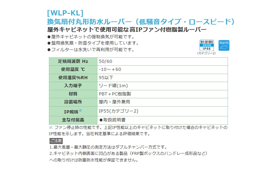 ホーム > 日東工業 熱関連機器 > 換気扇・ルーバー > 日東工業 WLP-17KL・WLP-17KLC AC100V 換気扇付丸形防水ルーバー(低騒音タイプ・ロースピード)