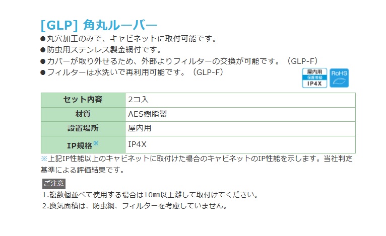 ホーム > 日東工業 熱関連機器 > 換気扇・ルーバー > 日東工業 GLP-0・GLP-0C 角丸ルーバー(2個入り)