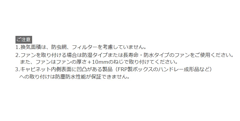 | 仕様 | フィルタ付 (ポリエステル製、除塵率80%) 屋内・屋外兼用 IP規格:IP55(カテゴリー2) 寸法㎜:外形φ80 換気面積㎠:8.5 取付可能ファンサイズ:□60 |