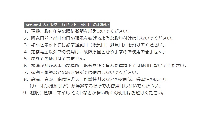 | 仕様 | 屋内用 IP規格:IP4X 定格電圧 V(単相):AC100 寸法mm:ヨコ155・タテ155・フカサ54 入力端子:2端子 取付ファン:PF-091C (1コ) |