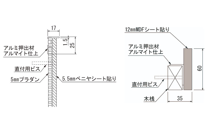 フレーム:アルミ押出材ブラックアルマイト仕上・12mmMDF木目シート貼り・