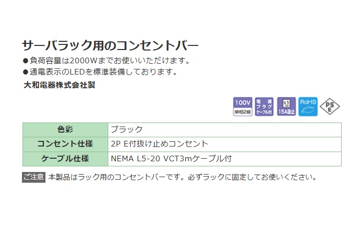 ケーブル仕様:NEMA L5-20 VCT3mケーブル付