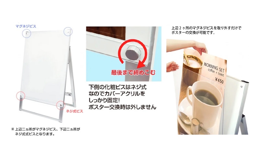 ・磁石を利用したビスによりポスターを画期的に簡単に交換できる次世代スタンド看板です。