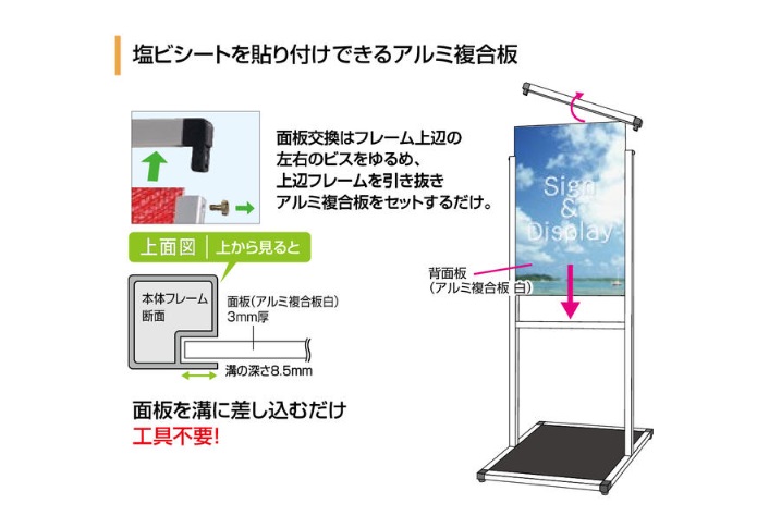 ・小スペースでも設置できるインクジェットシートを貼り付けて使用する直立型スタンド