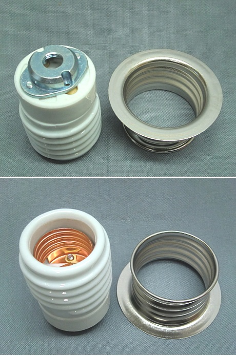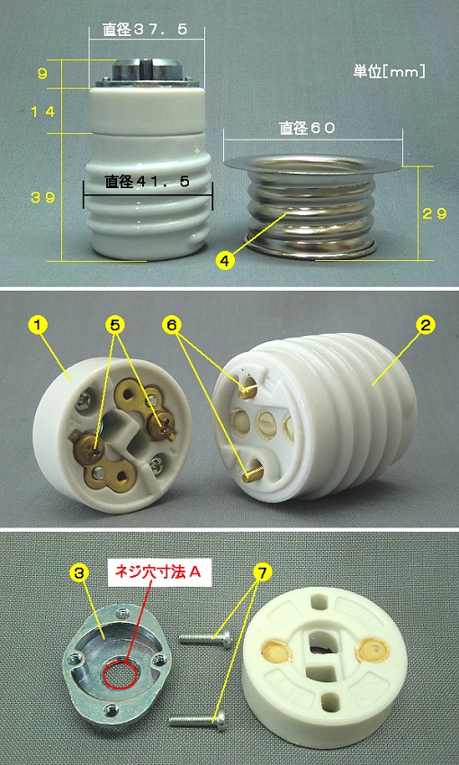 | 仕様 | ネジ穴寸法:PF1/8(直径9mm) 口金寸法:E26 結線方法:ビス止め(電線にM3.5用端子を付ける) 対応電線:VFF0.75㎟ IV0.9㎟など 定格:6A 300V |