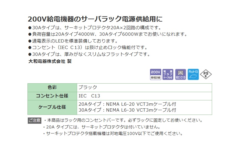 ケーブル仕様:20Aタイプ:NEMA L6-20 VCT3mケーブル付