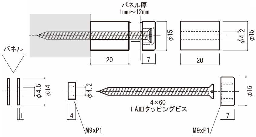 ●タッピングビス1本でパネルから台座、壁面まで通して固定パネルを浮かせるタイプ