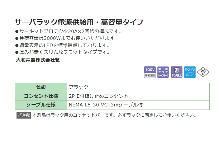 ケーブル仕様:NEMA L5-30 VCT3mケーブル付
